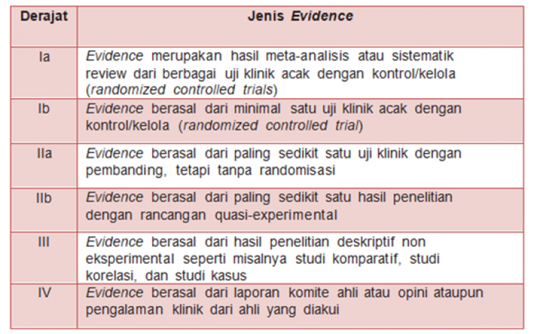 Penelitian ilmiah sebagai dasar dari pengambilan keputusan klinik, memiliki level bukti sebagai berikut: (dari bukti terlemah hingga terkuat)